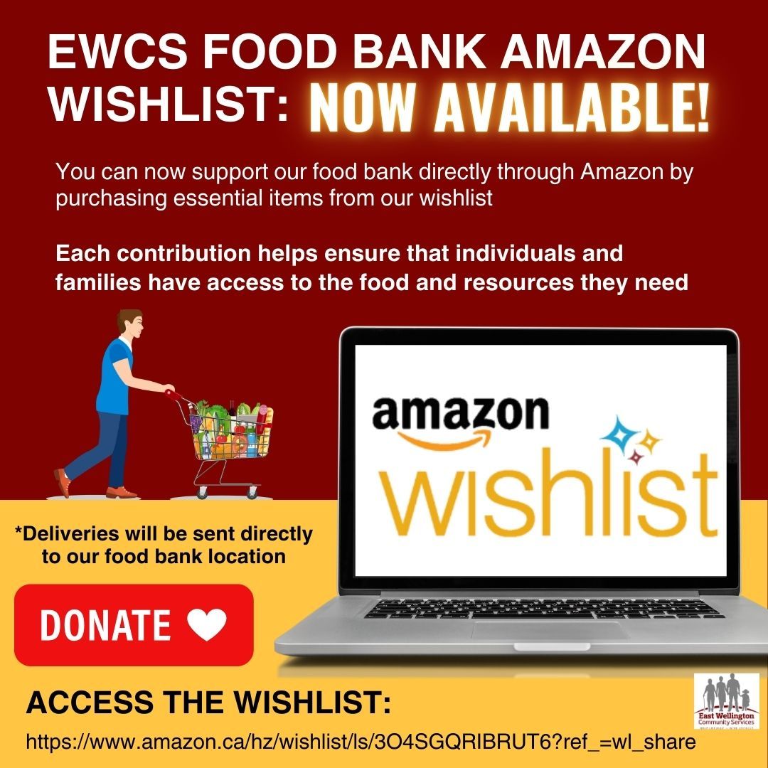 East Wellington Community Services (EWCS) is excited to announce the launch of our Amazon Wishlist for the EWCS Food Bank. This new initiative offers community members an alternative way to support individuals and families in need by purchasing essential items directly from our curated list.